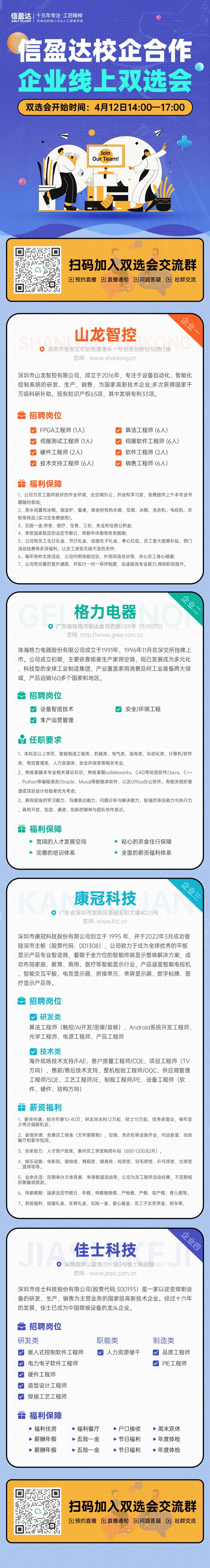 信盈达校企合作专场线上招聘会(山龙智控,格力电器、康冠科技、佳士科技)4月12日14:00