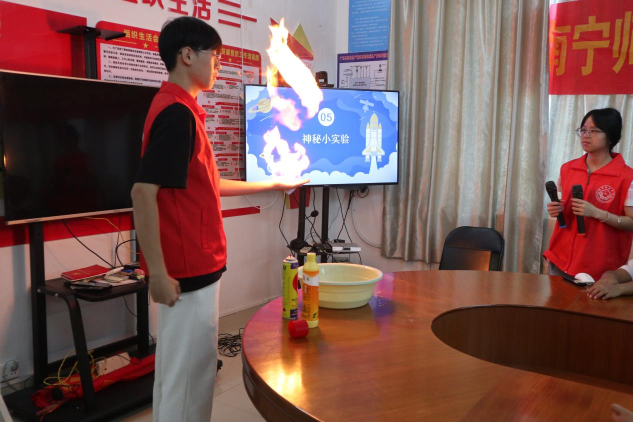 其次,“青春强国行”以物理学科魅力为引,寓教于乐,激发儿童物理兴趣与探索精神,培养创新思维与实践能力。实践团以一系列创意十足的趣味实验——“不破的泡泡”、“深海静电章鱼”及“掌上火焰”,让孩子们在动手操作中体验到科学的神奇与魅力。实验结束后,实践团详细地给孩子们解释实验原理,并将原理与日常生活相联系,拓宽了孩子们的科学视野。其中,“掌上火焰”实验成为防火安全教育的生动教材,孩子们在惊叹之余,也深刻认识到了防火的重要性。